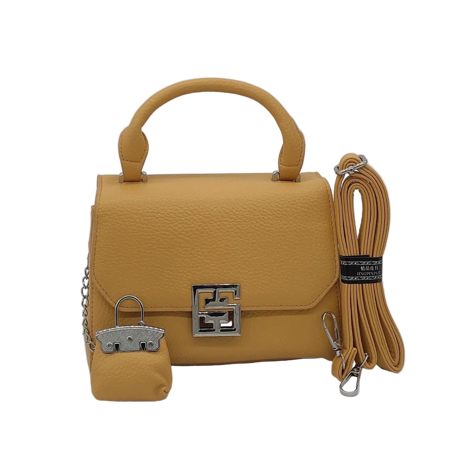 Premium Mustard Yellow Faux Leather Handbag Set with Crossbody Strap & Keychain